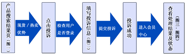 產品搜索結果頁帶有“現貨”、“熱賣”、“優勢”標識的產品信息,均有“投訴”按鈕(如圖一):